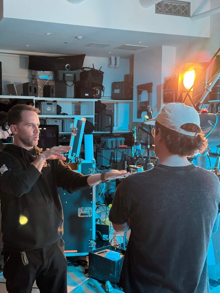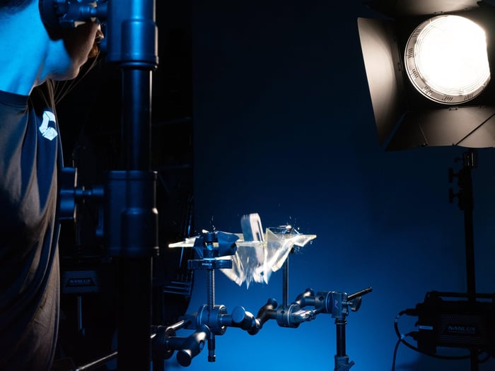 During the shoot itself, Gabe worked to capture our vision with handheld rigs and the Bolt arm. A lot of careful planning was involved with each shot and not everything could be done repeatedly (you can only break but so much glass in a day) so we leaned heavily on Gabe's expertise to get things done efficiently. "The choreography of some of the wider studio shots ended up being the most technically complicated."